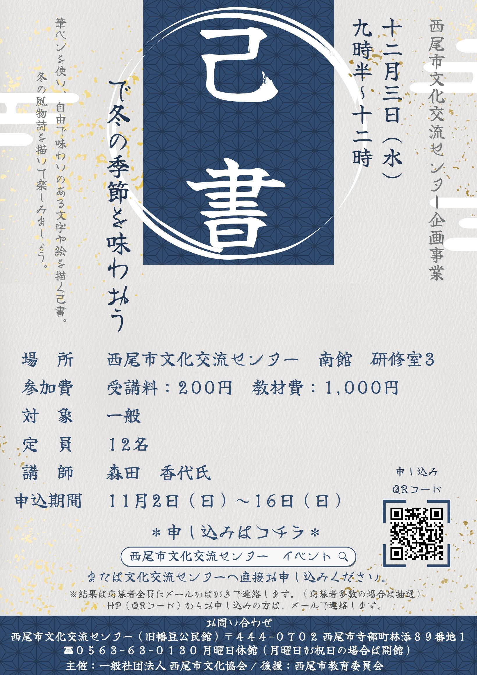 己書で冬の季節を味わおう 申込受付延長しました。 開催日時 2025年12月3日(水) 9時30分~12時 場所 西尾市文化交流センター 南館1階 研修室3 (旧幡豆ふれあいセンター・西尾市寺部町浜田69番地) 参加費 受講料:200円 教材費:1,000円 定員 12名 ※応募者多数の場合は抽選。結果は応募者全員にメールかハガキでご連絡します。 (ホームページからお申し込みの方はメールで返信します。 結果のメールが届かない場合は迷惑フォルダをご確認ください。) 申込期間 11月2日(日)~11月16日(日) 講師 森田 香代氏 問合せ先 西尾市文化交流センター ☎0563-63-0130 ✉hazuevent@nishiobunka.jp イベント名 己書で冬の季節を味わおう 申込受付延長しました。 お名前必須 フリガナ必須 ご住所必須 郵便番号 都道府県 都道府県 北海道 青森県 岩手県 宮城県 秋田県 山形県 福島県 茨城県 栃木県 群馬県 埼玉県 千葉県 東京都 神奈川県 新潟県 富山県 石川県 福井県 山梨県 長野県 岐阜県 静岡県 愛知県 三重県 滋賀県 京都府 大阪府 兵庫県 奈良県 和歌山県 鳥取県 島根県 岡山県 広島県 山口県 徳島県 香川県 愛媛県 高知県 福岡県 佐賀県 長崎県 熊本県 大分県 宮崎県 鹿児島県 沖縄県 市区町村、番地 電話番号必須 メールアドレス必須 この講座をどこで知りましたか。 文化交流センターHP まなスタ 広報にしお 知人から 公共施設チラシ インスタ・フェイスブック その他
