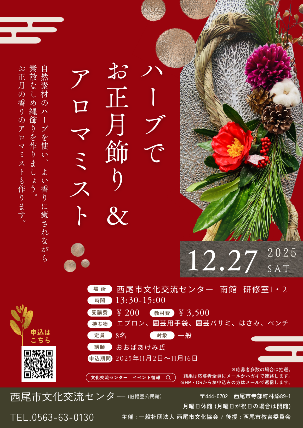 - 西尾市文化交流センター ☎0563-63-0130 ✉hazuevent@nishiobunka.jp