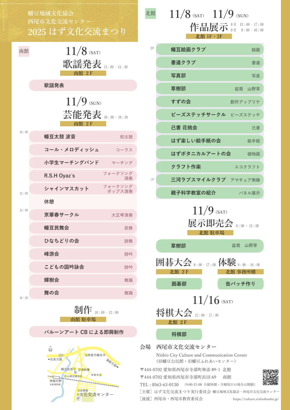 2025 はず文化交流まつり 開催日時 2025年11月8日(土)午後1時~午後5時 11月9日(日)午前9時~午後4時半 会場 西尾市文化交流センター 全館 (旧幡豆公民館・旧幡豆ふれあいセンター) 駐車場のご案内 西尾市文化交流センターの駐車場は大変狭いため、なるべく徒歩または乗り合わせでご来場ください。 または西尾市役所幡豆支所の駐車場もあわせて、ご利用ください。 問合せ先 西尾市文化交流センター ☎0563-63-0130 ✉ hazu-evennt@nishiobunka.jp